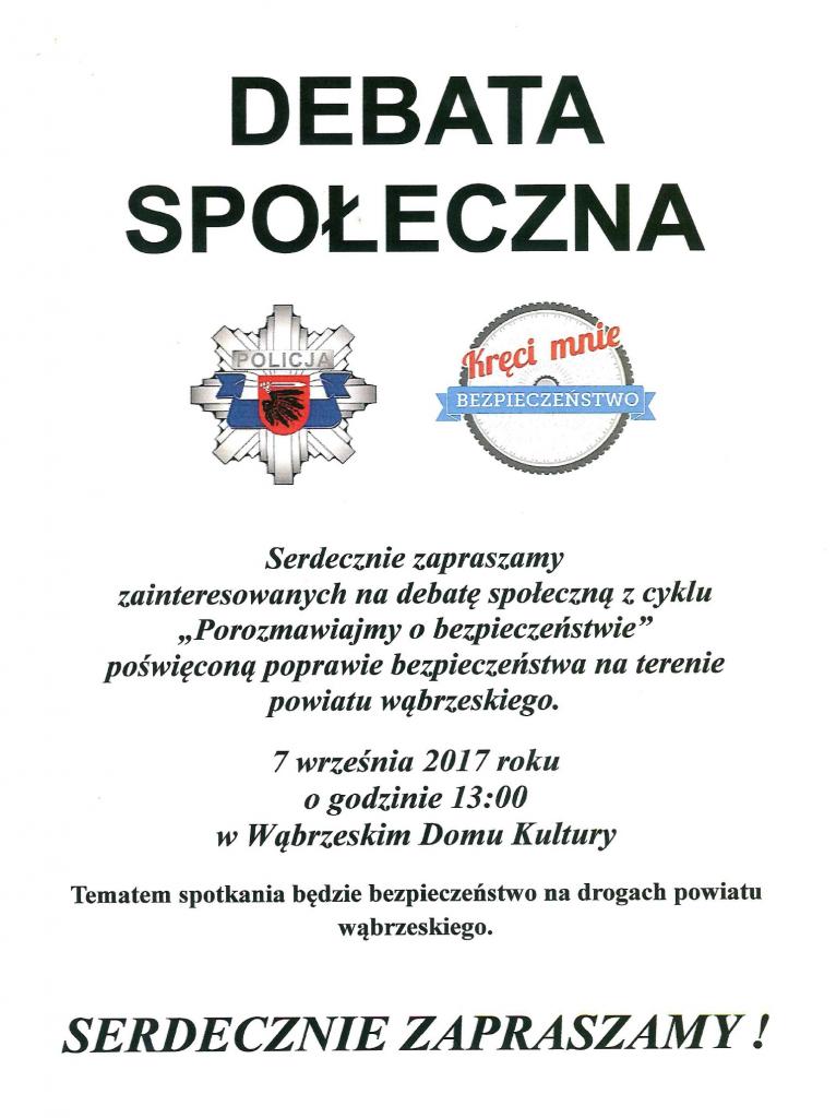 Policjanci zapraszają mieszkańców powiatu na debatę społeczną. Tematem dyskusji będzie bezpieczeństwo na drogach powiatu wąbrzeskiego. 7 września, godz. 13.00 w WDK.