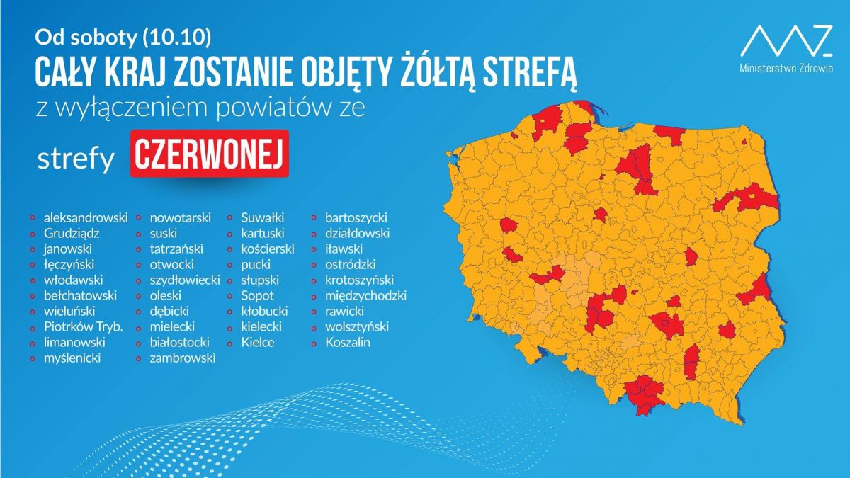 Od soboty, 10 października, na nowej liście znajdą się 32 powiaty i 6 miast. Bardzo ważną zmianą jest likwidacja strefy żółtej - zasady w niej obowiązujące zostają rozciągnięte na cały kraj.