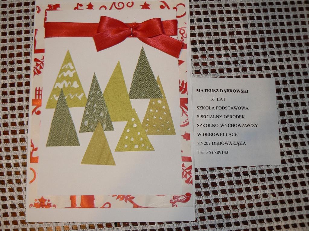 Dnia 10 grudnia 2019 roku w Wąbrzeskim Domu Kultury rozdano nagrody za prace wykonane w Wojewódzkim Konkursie Plastycznym „Kartka Świąteczna”. Jak zwykle konkurs stał na bardzo wysokim poziomie. Młodzi artyści zastosowali różne techniki plastyczne oraz materiały do prac. Tym bardziej cieszymy się , że wśród wyróżnionych znalazło się dwoje uczniów ze Specjalnego Ośrodka Szkolno-Wychowawczego w Dębowej Łące.