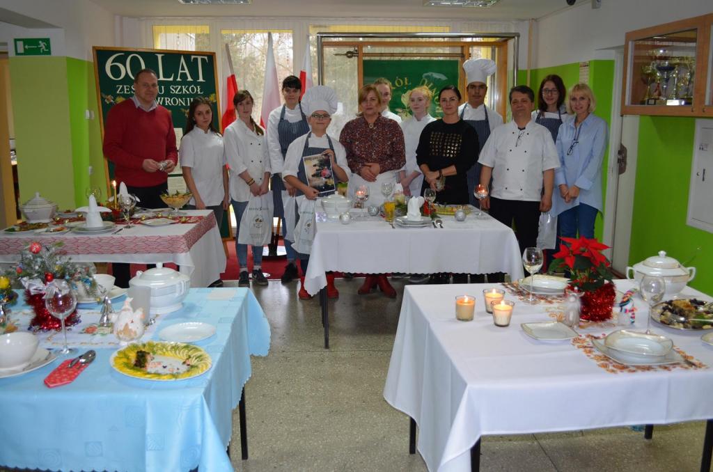 Tydzień przedświąteczny stwarzał niecodzienny klimat, aby zaangażować młodzież technikum żywienia i usług gastronomicznych do kultywowania tradycji wigilijnych. Ogłosiliśmy konkurs, który udało nam się zrealizować dzięki podarowanej przez firmę Veroni zastawie stołowej. Kilka propozycji dekoracji stołów wigilijnych uświetniło korytarz szkolny, tak aby cała społeczność szkolna mogła zaczerpnąć inspiracji dekoracji świątecznych tworzących ciepły i miły nastrój. Nie tylko piękna zastawa Veroni ozdobiła stoły ale również potrawy z ryb przygotowane przez drużyny konkursowe.