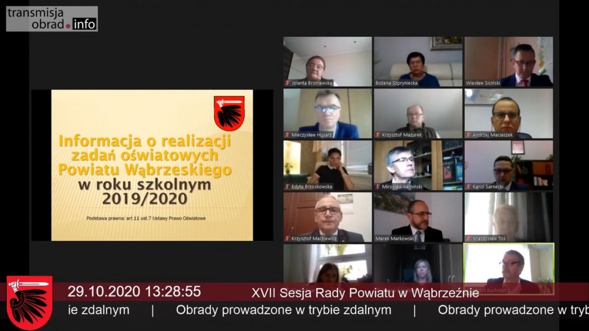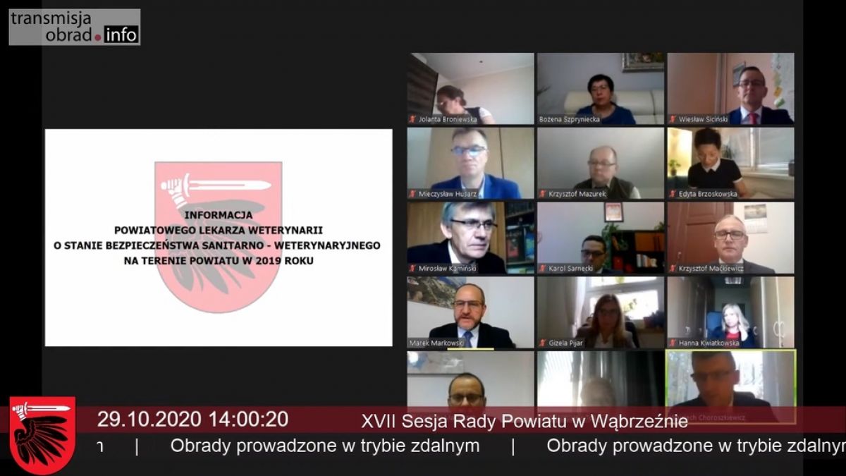 W dniu 29 października 2020 roku odbyła się w trybie zdalnym XVII sesja Rady Powiatu w Wąbrzeźnie. Po przyjęciu porządku obrad, Starosta Wąbrzeski przedstawił informację z prac Zarządu Powiatu w okresie między sesjami oraz z wykonania uchwał Rady Powiatu. Następnie zaprezentowano informację o oświadczeniach majątkowych zobowiązanych do tego pracowników Starostwa i jednostek organizacyjnych oraz radnych.