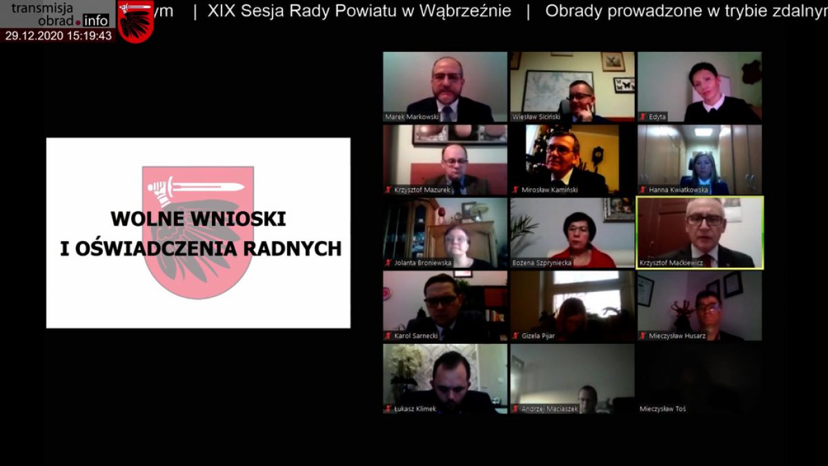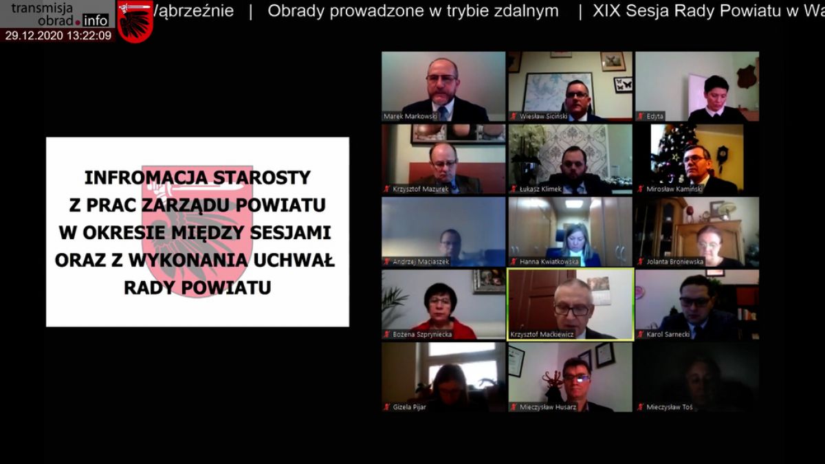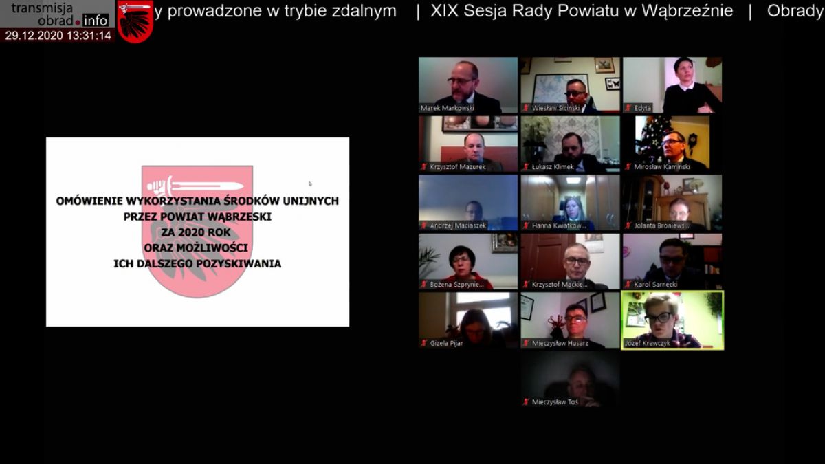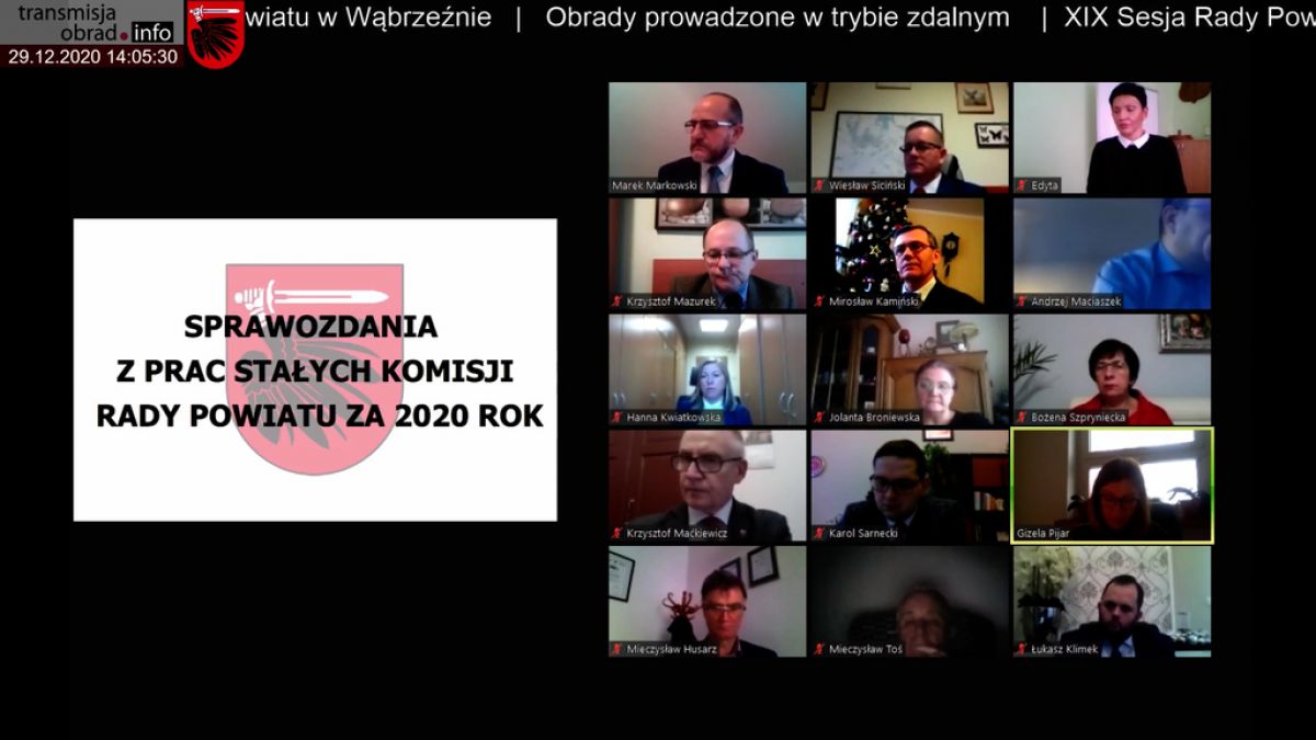 W dniu 29 grudnia 2020 roku odbyła się w trybie zdalnym XIX sesja Rady Powiatu w Wąbrzeźnie. Po przyjęciu porządku obrad, Starosta Wąbrzeski przedstawił informację z prac Zarządu Powiatu w okresie między sesjami oraz z wykonania uchwał Rady Powiatu, po czym radni zapoznali się ze informacją o wykorzystaniu przez powiat środków unijnych w 2020 roku oraz ze sprawozdaniem z prac stałych komisji Rady Powiatu.