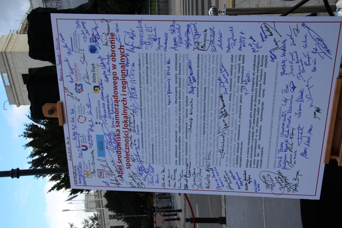 Zgromadzeni przedstawiciele samorządów jednogłośnie przyjęli apel środowiska samorządowego „W obronie społeczności lokalnych i regionalnych”. Po jego uroczystym podpisaniu przez przedstawicieli organizacji samorządowych, uczestnicy spotkania udali się przed siedzibę Sejmu RP, gdzie wręczyli apel na ręce Wicemarszałków Sejmu – Małgorzaty Kidawy-Błońskiej, Włodzimierza Czarzastego i Piotra Zgorzelskiego. Przed gmachem Sejmu głos ponownie zabrali przedstawiciele samorządów wszystkich szczebli. Reprezentujący Związek Powiatów Polskich Mirosław Czapla podkreślał, jak ważna jest jedność w walce o prawa samorządu.