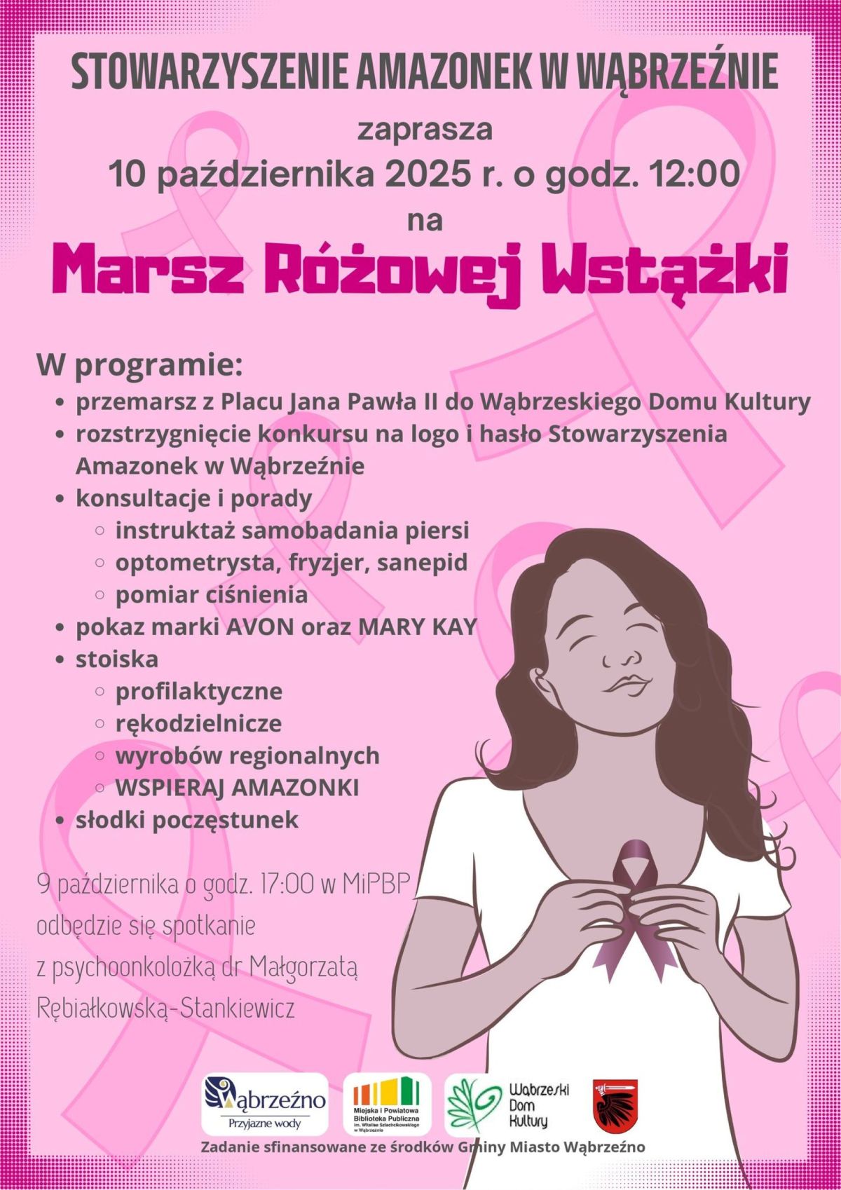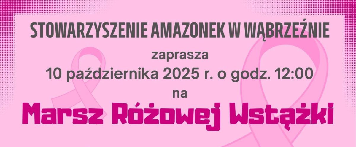 Stowarzyszenie Amazonek w Wąbrzeźnie serdecznie zaprasza wszystkich mieszkańców Powiatu Wąbrzeskiego na wyjątkowe wydarzenie – Marsz Różowej Wstążki, który odbędzie się 10 października 2025 r. o godz. 12:00.