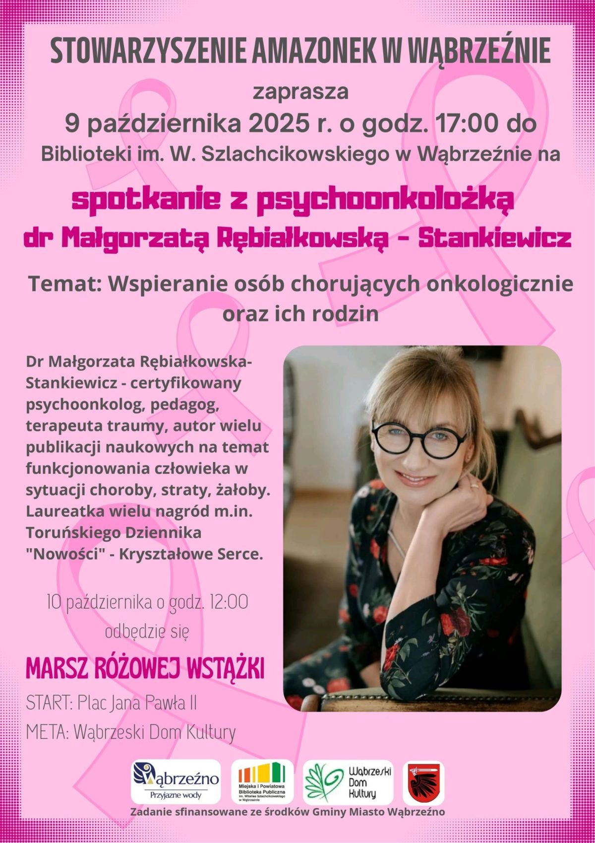 A dzień wcześniej, 9 października o godz. 17:00 w Miejskiej i Powiatowej Bibliotece Publicznej w Wąbrzeźnie, zapraszamy na spotkanie z psychoonkolożką dr Małgorzatą Rębiałkowską-Stankiewicz. Tematem spotkanie będzie „Wspieranie osób chorujących onkologicznie oraz ich rodzin”.