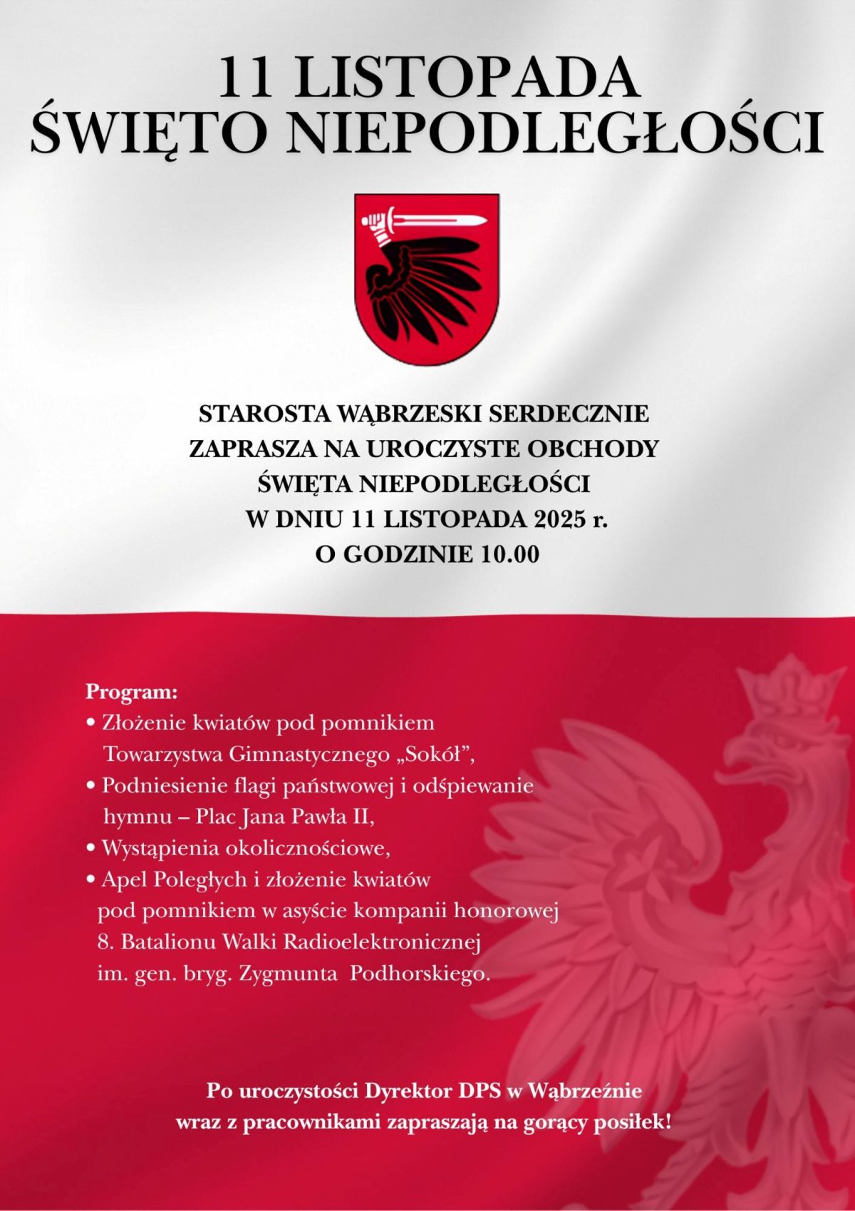 Starosta Wąbrzeski serdecznie zaprasza na uroczyste obchody Święta Niepodległości, które odbędą się w dniu 11 listopada 2025 roku o godz. 10:00.