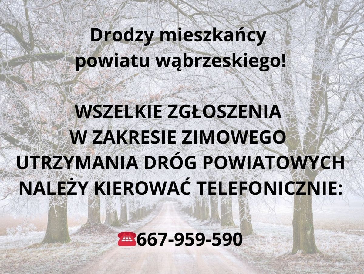 • Drodzy mieszkańcy powiatu wąbrzeskiego! WSZELKIE ZGŁOSZENIA W ZAKRESIE ZIMOWEGO UTRZYMANIA DRÓG POWIATOWYCH NALEŻY KIEROWAĆ...