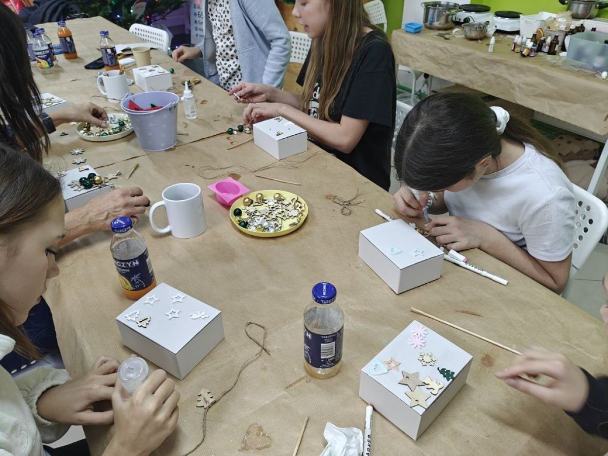 Grudzień upływa w naszym klubie w wyjątkowo świątecznej atmosferze. Podczas zajęć zorganizowanych przez Powiatowe Centrum Pomocy Rodzinie odbyły się kreatywne warsztaty świąteczne, podczas których uczestnicy wspólnie tworzyli wyjątkowe świąteczne boksy.    W środku znalazły się m.in. własnoręcznie wykonane mydełka i świece sojowe – drobiazgi, które idealnie sprawdzą się jako prezenty dla najbliższych.