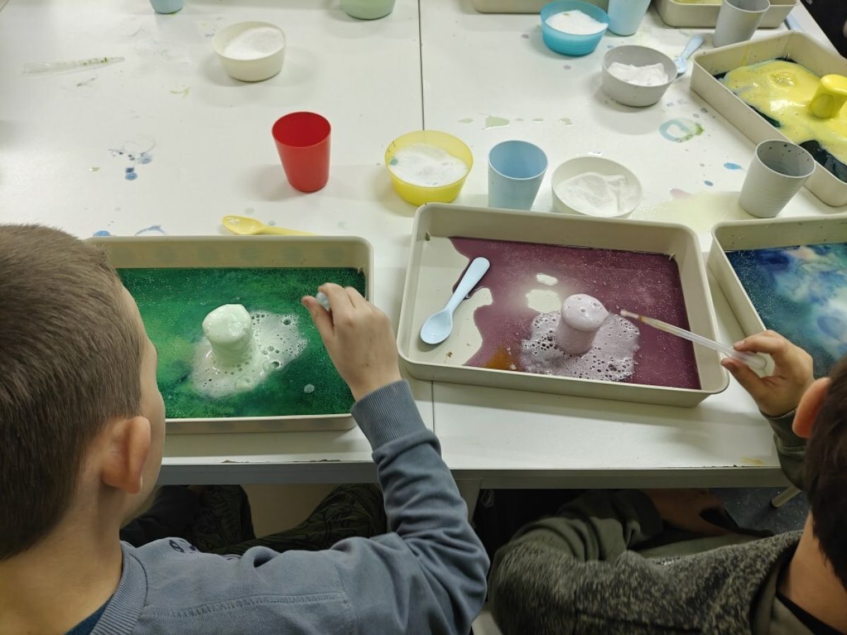 Podczas zajęć z młodszą grupą zorganizowaliśmy warsztaty eksperymentów chemicznych z wykorzystaniem naturalnych składników. Dzieci z ogromnym zaangażowaniem łączyły sodę oczyszczoną z kwaskiem cytrynowym, obserwując fascynujące reakcje. Była to doskonała okazja do nauki poprzez zabawę oraz rozwijania ciekawości świata.