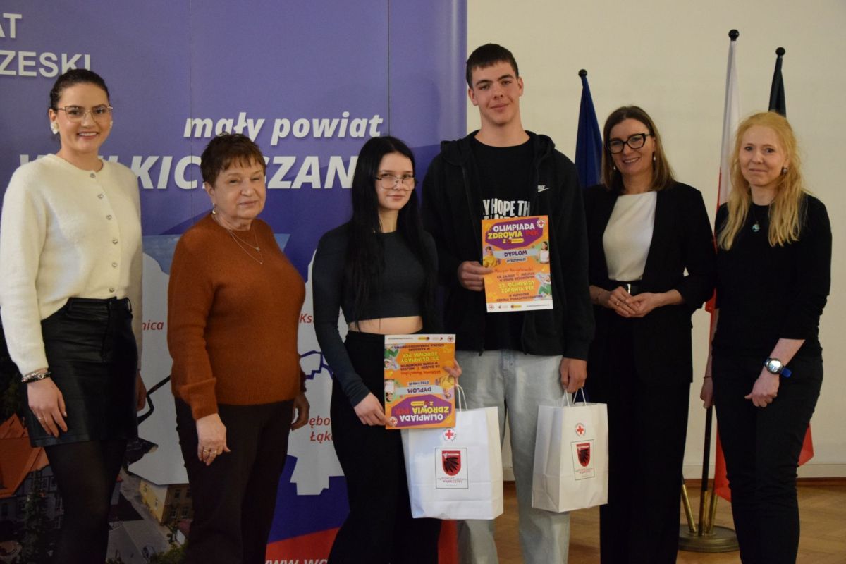 W dniu 14 stycznia 2026 roku w Starostwie Powiatowym w Wąbrzeźnie odbył się etap rejonowy XXXIII edycji Ogólnopolskiej Olimpiady Zdrowia z Biedronką organizowanej przez największą i najstarszą humanitarną organizację międzynarodową w Polsce - Polski Czerwony Krzyż. Po sprawdzeniu testu wręczono dyplomy i nagrody uczestnikom. Wicestarosta Pani Gizela Pijar i Pani Anna Gołąbiewska Kierownik Wydziału Oświaty, Zdrowia, Kultury i Sportu reprezentujące Starostwo Powiatowe w Wąbrzeźnie wspólnie z przedstawicielami Delegatury PCK w Wąbrzeźnie z Panią Izabelą Jędrzejczyk i Panią Krystyną Kawczyńską złożyły gratulacje uczniom oraz podziękowały opiekunowi Panu Szymonowi Krawczykowi za przygotowanie młodzieży do olimpiady.