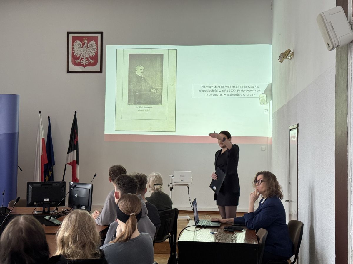 Spotkanie poprowadziła Pani Anna Gołąbiewska – Kierownik Wydziału Oświaty, Zdrowia, Kultury i Sportu, która przybliżyła młodzieży zasady funkcjonowania Zarządu i Rady Powiatu oraz strukturę Starostwa Powiatowego. Uczniowie dowiedzieli się również, jakie zadania realizują poszczególne wydziały urzędu. W wydarzeniu uczestniczyła także Wicestarosta Pani Gizela Pijar, która opowiedziała o historycznych wątkach związanych ze Starostwem, pierwszym Staroście Powiatu oraz zachęcała młodzież do refleksji nad ewentualną przyszłą pracą w strukturach Starostwa Powiatowego w Wąbrzeźnie.
