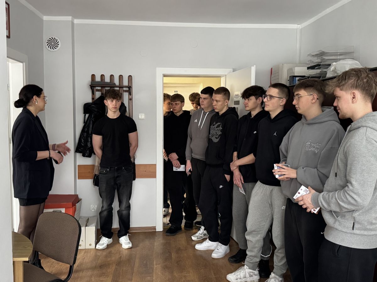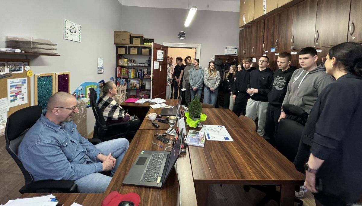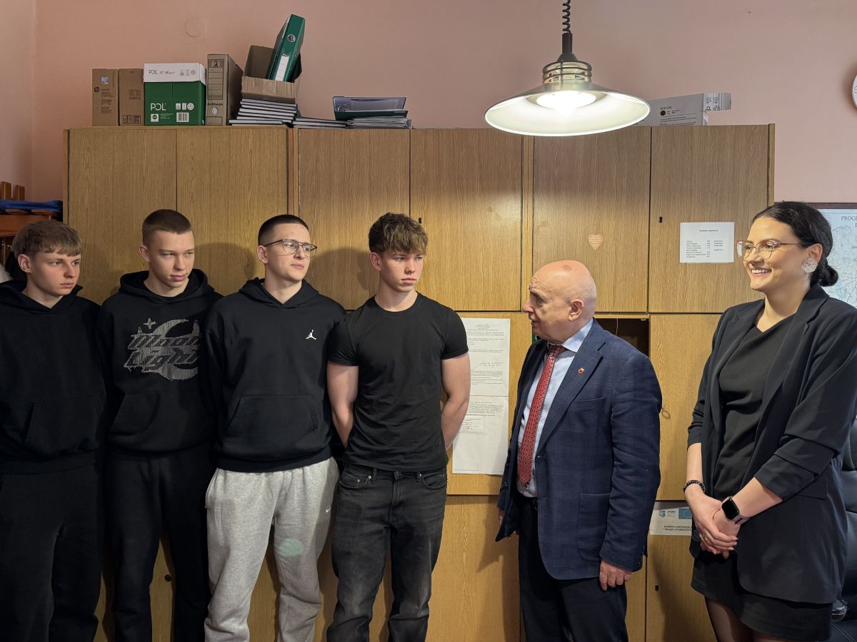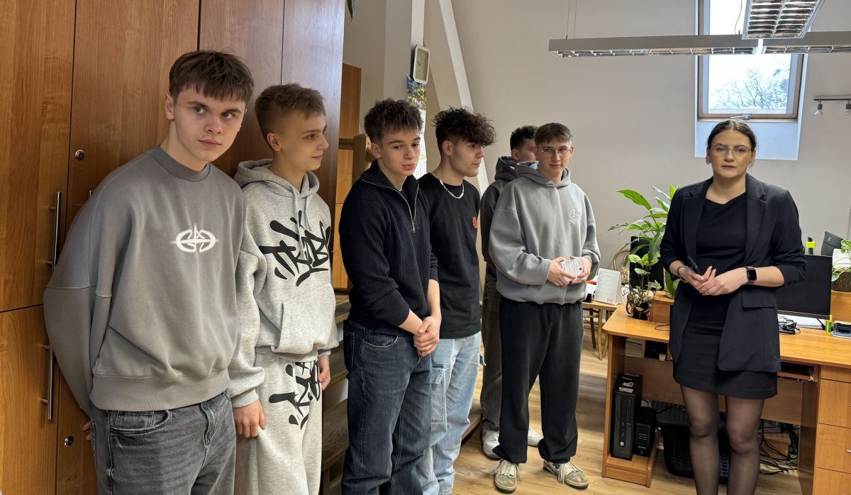 Uczniowie mieli również okazję zajrzeć „za kulisy” urzędu – zwiedzili biura Starosty i Wicestarosty oraz poznali układ organizacyjny Starostwa. Bardzo ciepło zostali przyjęci przez kierowników wydziałów, m.in. Pana Karola Eichbergera – Kierownika Wydziału Rolnictwa, Ochrony Środowiska i Gospodarki Wodnej oraz Pana Mirosława Okrasę – Zastępcę Kierownika Wydziału Organizacyjnego, który opowiedział o zasadach zakładania profilu zaufanego, a także Pana Pawła Sarneckiego – Inspektora ds. obronnych, zarządzania kryzysowego i obrony cywilnej. W tym zakresie uczniowie mieli okazję zobaczyć ćwiczenia z łączności na wypadek zagrożenia bombardowaniem.