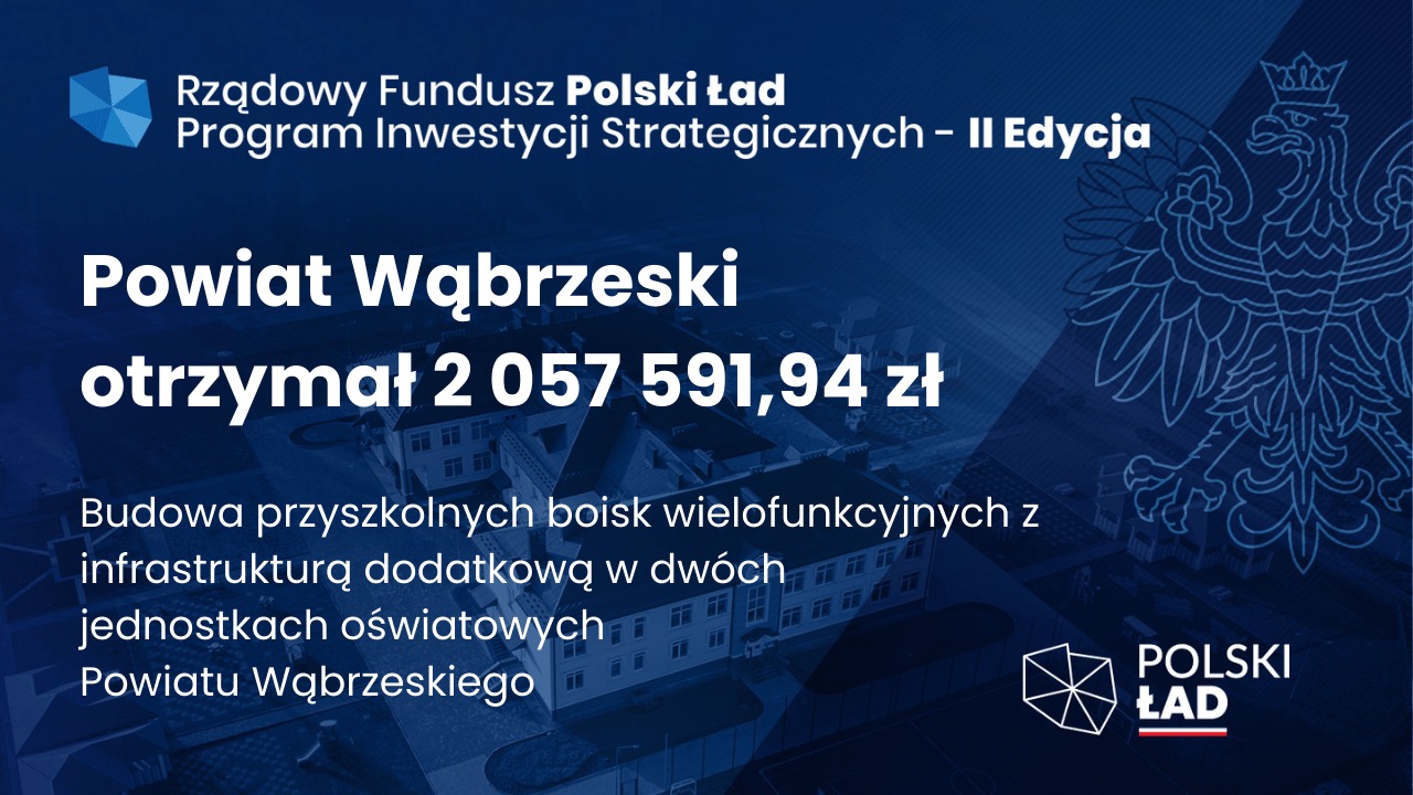 Powiat Wąbrzeski otrzymał 2 057 591,94 zł z Rządowego Funduszu Polski Ład – Program Inwestycji Strategicznych – II Edycja. W ramach projektu wybudowane zostaną przyszkolne boiska wielofunkcyjne z infrastrukturą dodatkową przy Zespole Szkół w Wąbrzeźnie oraz Zespole Szkół Ogólnokształcących Wąbrzeźnie.