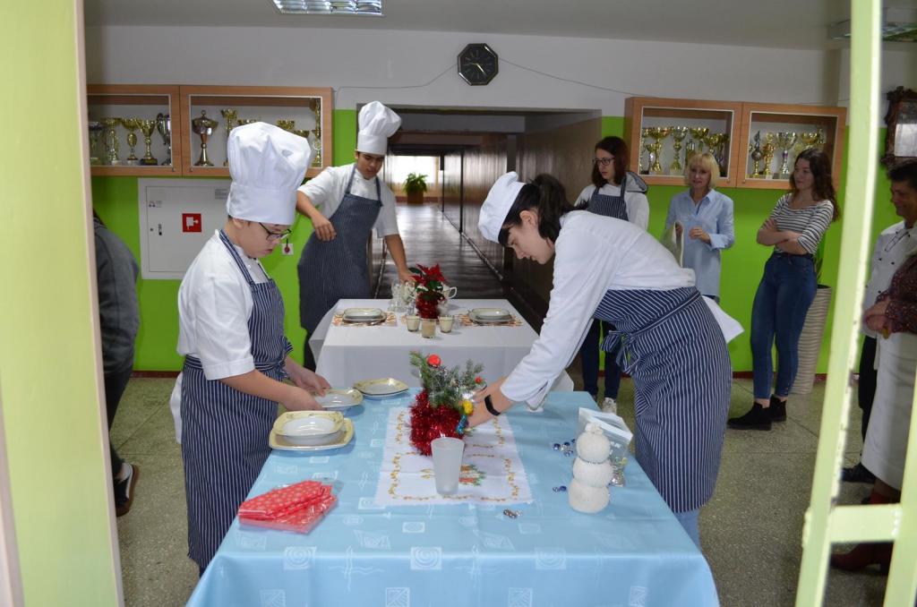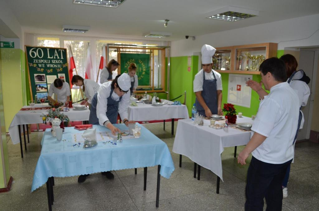 Tydzień przedświąteczny stwarzał niecodzienny klimat, aby zaangażować młodzież technikum żywienia i usług gastronomicznych do kultywowania tradycji wigilijnych. Ogłosiliśmy konkurs, który udało nam się zrealizować dzięki podarowanej przez firmę Veroni zastawie stołowej. Kilka propozycji dekoracji stołów wigilijnych uświetniło korytarz szkolny, tak aby cała społeczność szkolna mogła zaczerpnąć inspiracji dekoracji świątecznych tworzących ciepły i miły nastrój. Nie tylko piękna zastawa Veroni ozdobiła stoły ale również potrawy z ryb przygotowane przez drużyny konkursowe.