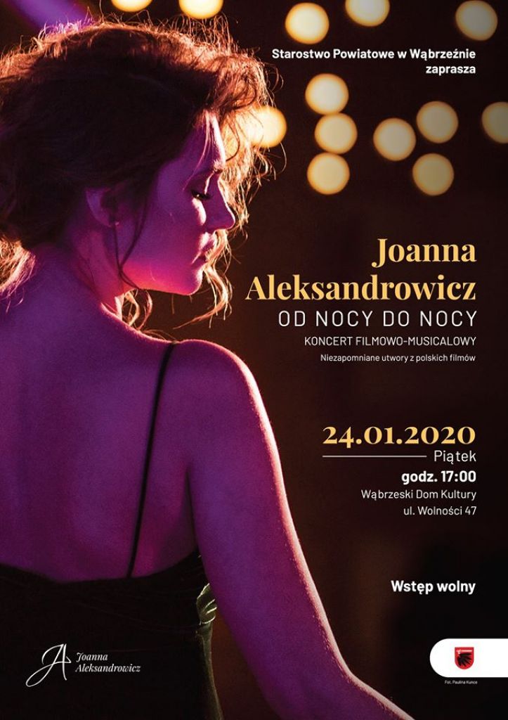 Joanna Aleksandrowicz to aktorka młodego pokolenia, występowała między innymi na deskach Teatru Muzycznego w Gdyni, Teatru Polskiego we Wrocławiu, Novej Scenie w Bydgoszczy oraz gościnnie na scenie Teatru Roma w Warszawie. Współpracuje z topowymi reżyserami m.in.: Smarzowskim, Koterskim, Szurmiejem. Jako Wokalistka spełnia się we własnym projekcie filmowo - musicalowym „Od nocy do nocy” regularnie występując na różnego rodzaju wydarzeniach muzycznych w całej Polsce, ale i za granicą. Na wąbrzeskiej scenie Joanna Aleksandrowicz wystąpi z repertuarem niezapomnianych utworów z polskich filmów i musicali np. Noce i dnie, Vabank, Metro. Wykonywane przez artystkę utwory są pełne przemyśleń i refleksji.