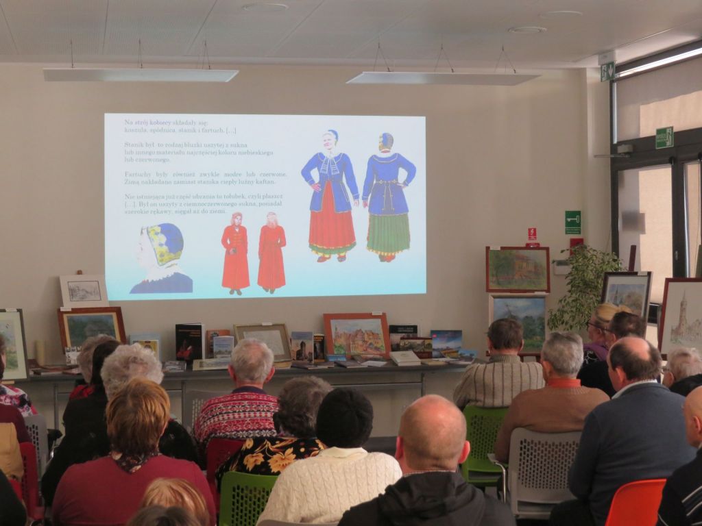 W pełni zgadzając się z opinią pani Cecylii bibliotekarka Agnieszka Błaszak przygotowała dla naszych gości prezentację multimedialną zatytułowaną „Ziemia chełmińska – obrzędy i zwyczaje”. Przypomnieliśmy w niej elementy tradycyjnego stroju ludowego, charakterystyczne cechy tutejszej architektury i przedmiotów codziennego użytku. Następnie omówiliśmy zwyczaje weselne i wysłuchaliśmy przyśpiewek śpiewanych podczas oczepin. Dokładnie przypomnieliśmy sobie obrzędy związane z Wielkanocą, takie jak „wybijanie żuru”, „boże rany”, czy dyngus. Wszyscy obiecaliśmy sobie, że nasze tegoroczne palmy wielkanocne będą takie, jak to „drzewiej bywało”, czyli skromne, składające się jedynie z wierzbowych gałązek i zelonego bukszpanu. Strojne i kolorowe palmy w stylu „wileńskim” to, jak sama nazwa wskazuje - tradycja napływowa.