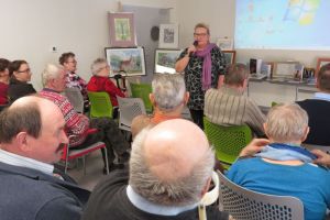 W drugiej części spotkania uczestnicy mieli okazję obejrzeć prezentowaną aktualnie w bibliotece wystawę obrazów Cecylii Szymańskiej. Pani Cecylia to mieszkanka Dębowej Łąki, wieloletnia nauczycielka plastyki, która po przejściu na emeryturę oddała się malarstwu i wspaniale rozwinęła swój talent plastyczny. Tematyka jej prac jest bardzo różnorodna są to m.in. kwiaty, pejzaże oraz martwa natura. Maluje to co ją otacza i co jest najbliższe jej sercu. Wśród jej dorobku artystycznego znajdują się zarówno obrazy olejne, jak i akwarele czy rysunki. Prezentowany w bibliotece wyimek twórczości Pani Cecylii zatytułowany jest „Barwy ziemi chełmińskiej”. Znajdziemy tu zatem chatę ze Stanisławek, kościółek z Jarantowic, czy wiatrak z Kurkocina. „-Te wszystkie stare chaty, które giną już powoli z naszego krajobrazu, są elementem naszej kultury, naszego dziedzictwa – mówi artystka o swoim malowaniu – Przenosząc je na płótno, chcę zachować je dla naszych potomków.”