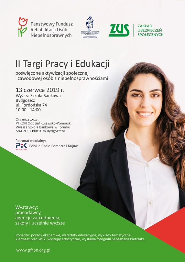 W najbliższy czwartek, 13 czerwca odbędą się II Targi Pracy i Edukacji poświęcone aktywizacji społecznej i zawodowej osób z niepełnosprawnościami. Organizatorami tego wydarzenia są: PFRON – Kujawsko-Pomorski Oddział Wojewódzki w Toruniu, Oddział ZUS w Bydgoszczy oraz Wyższa Szkoła Bankowa w Bydgoszczy.