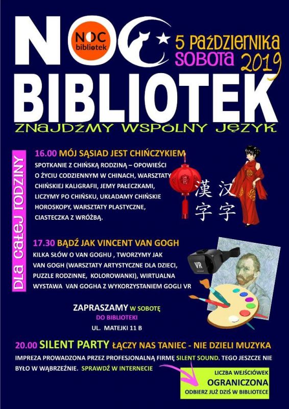 Warsztaty pn. "Mój sąsiad jest Chińczykiem" oraz Silent party to nie jedyne atrakcje tegorocznej edycji nocy w wąbrzeskiej bibliotece!