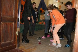 W naszych strojach widoczne były dyniowe- pomarańczowe akcenty. Na andrzejkach nie może zabraknąć oczywiście wróżb - dowiedzieliśmy się wiele o swojej przyszłości. Wchodząc do dyniowego domku, spotkaliśmy wróżkę, która opowiadała nam co nas czeka w przyszłości. Jednych miłość, drugich daleka podróż, a jeszcze innych bogactwo... ;) Był też taniec na dyni, taniec z balonem- dynią i wróżby pod kubeczkami. Każdej zabawie andrzejkowej towarzyszy pytanie - "Kto pierwszy wyjdzie za mąż/ się ożeni? " - my odpowiedź już znamy! Z ustawionych butów pierwszy próg przekroczył but Amelki, a zaraz potem Kuby! Kręciliśmy również butelką, która wskazywała nam dynie, a dynie natomiast wróżyły nam przyszły zawód - wśród nas będą piosenkarki, kucharze, a nawet rolnicy! Nie mogło zabraknąć oczywiście największych hitów disco polo, przy których bawiliśmy się świetnie! Czas nam umilały słodkości, m. in. pyszne muffinki upieczone przez klasę VI.