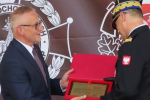 Komendant Wojewódzki PSP gen. Jacek Kaczmarek podczas uroczystości w uznaniu zasług na rzecz funkcjonowania i rozwoju Państwowej Straży Pożarnej wręczył podziękowanie w formie medalu pamiątkowego Krzysztofowi Maćkiewiczowi – Przewodniczącemu Konwentu Powiatów Województwa Kujawsko-Pomorskiego.