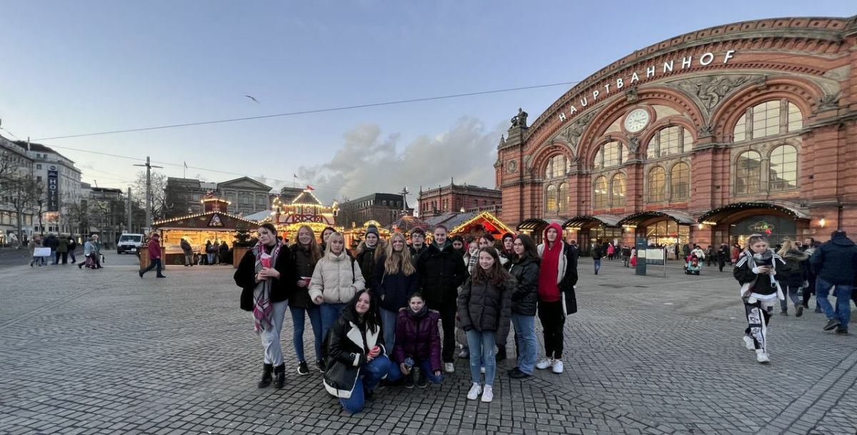 Pierwsza wymiana uczniowska odbyła się w dniach 4-12 grudnia 2022 roku. Do szkoły Realschule w Syke pojechało 10 uczniów Zespołu Szkół w Wąbrzeźnie wraz z opiekunkami panią Hanną Kowalską oraz panią Aleksandrą Ługiewicz. Program wymiany był bardzo napięty, oprócz zajęć w partnerskiej szkole Realschule i wizyty w sąsiadującej z nią BBS Schule, mieliśmy również spotkanie z burmistrz Syke, panią Suse Laue. Odwiedziliśmy także interaktywne muzeum emigracji w Bremenhaven, gdzie rozwiązując kolejno zadania z karty dla zwiedzających, śledząc notki biograficzne i zapiski w kartach pokładowych, odkrywaliśmy losy ludzi emigrujących z Europy do USA. Kolejne dni wypełniły nam wizyta w fabryce mercedesa w Bremie oraz zwiedzanie zabytkowego centrum Bremy. Grudzień to czas jarmarków bożonarodzeniowych, dlatego też cieszyliśmy się, że będąc w Bremie, mogliśmy być na jednym z najpiękniejszych jarmarków w Niemczech, poczuć jego magiczną atmosferę, zjeść prażone orzechy czy jabłka w karmelu. Oprócz nas były tam też rzesze turystów z Europy chcących zobaczyć słynny jarmark bożonarodzeniowy usytuowany wokół katedry św. Piotra i ratusza w Bremie. Wśród przeróżnych języków słyszanych na jarmarku, można było rozpoznać naszą mowę ojczystą.