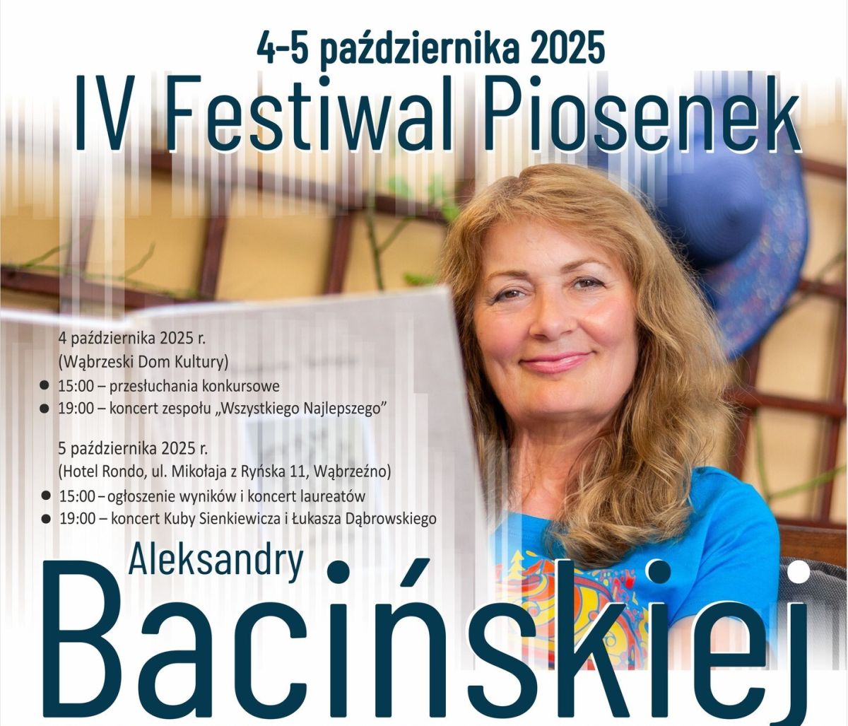 W dniach 4–5 października 2025 roku w Wąbrzeźnie odbędzie się IV Festiwal Piosenek Aleksandry Bacińskiej – wyjątkowe wydarzenie muzyczne, które na stałe wpisało się w kulturalny kalendarz naszego regionu.