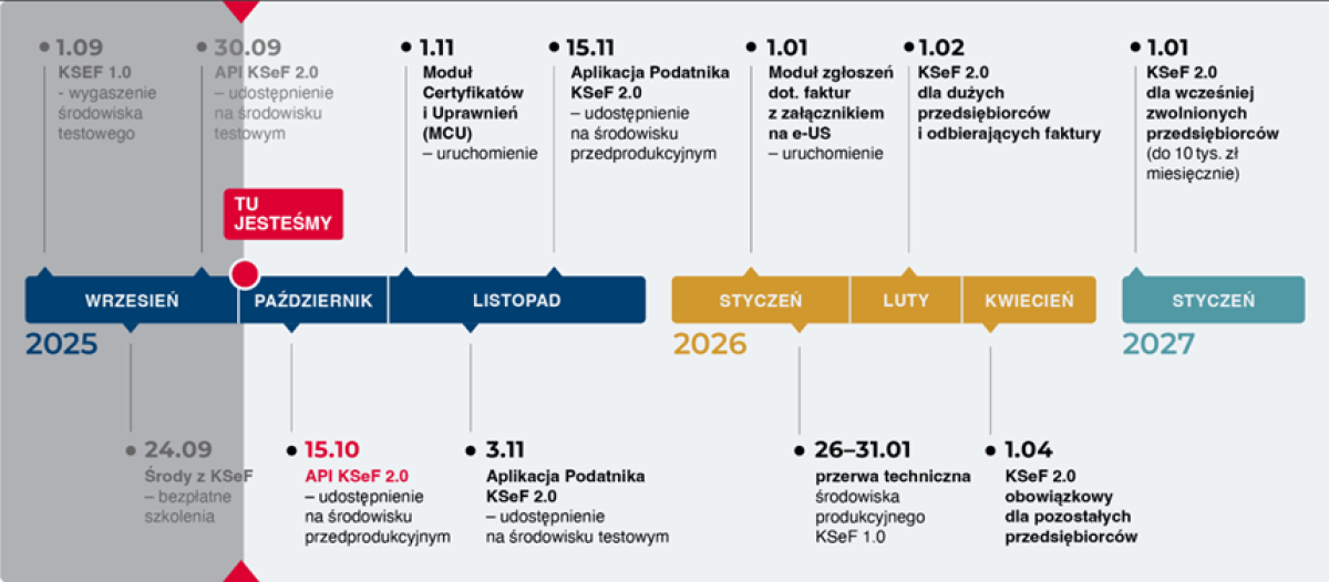 W najbliższym czasie Ministerstwo Finansów zaplanowało szereg działań związanych z wdrożeniem KSeF 2.0. Już 15 października udostępnione zostanie środowisko przedprodukcyjne systemu (DEMO), a od 1 listopada uruchomiony zostanie Moduł Certyfikatów i Uprawnień (MCU), poprzez który użytkownicy będą mogli zawnioskować o wydanie certyfikatu. W listopadzie zostaną udostępnione wersje testowa i przedprodukcyjna (DEMO) Aplikacji Podatnika KSeF. Kolejnym ważnym krokiem będzie uruchomienie 1 stycznia modułu zgłoszeń w e-Urzędzie Skarbowym dotyczącego wysyłki faktur z załącznikiem. Miesiąc później - 1 lutego - Ministerstwo Finansów udostępni wersję produkcyjną systemu KSeF 2.0.
