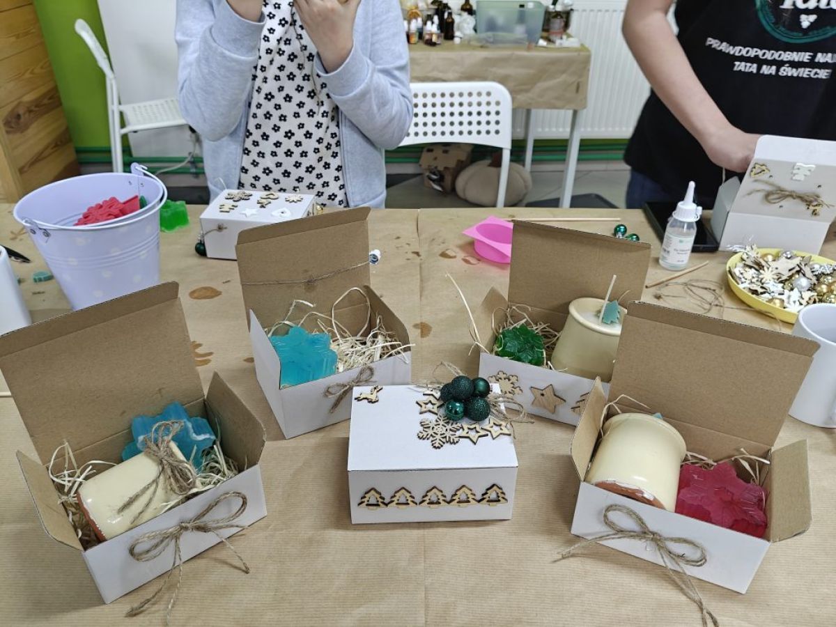 Grudzień upływa w naszym klubie w wyjątkowo świątecznej atmosferze. Podczas zajęć zorganizowanych przez Powiatowe Centrum Pomocy Rodzinie odbyły się kreatywne warsztaty świąteczne, podczas których uczestnicy wspólnie tworzyli wyjątkowe świąteczne boksy.    W środku znalazły się m.in. własnoręcznie wykonane mydełka i świece sojowe – drobiazgi, które idealnie sprawdzą się jako prezenty dla najbliższych.