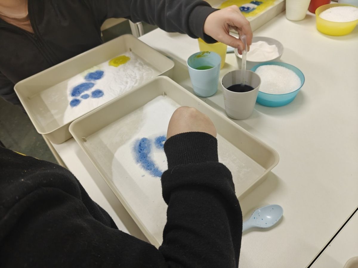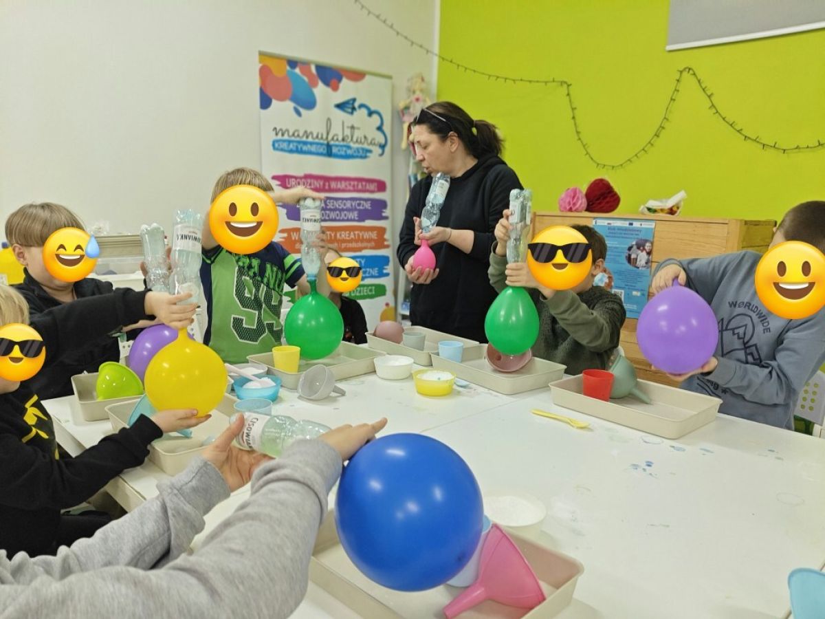 Podczas zajęć z młodszą grupą zorganizowaliśmy warsztaty eksperymentów chemicznych z wykorzystaniem naturalnych składników. Dzieci z ogromnym zaangażowaniem łączyły sodę oczyszczoną z kwaskiem cytrynowym, obserwując fascynujące reakcje. Była to doskonała okazja do nauki poprzez zabawę oraz rozwijania ciekawości świata.