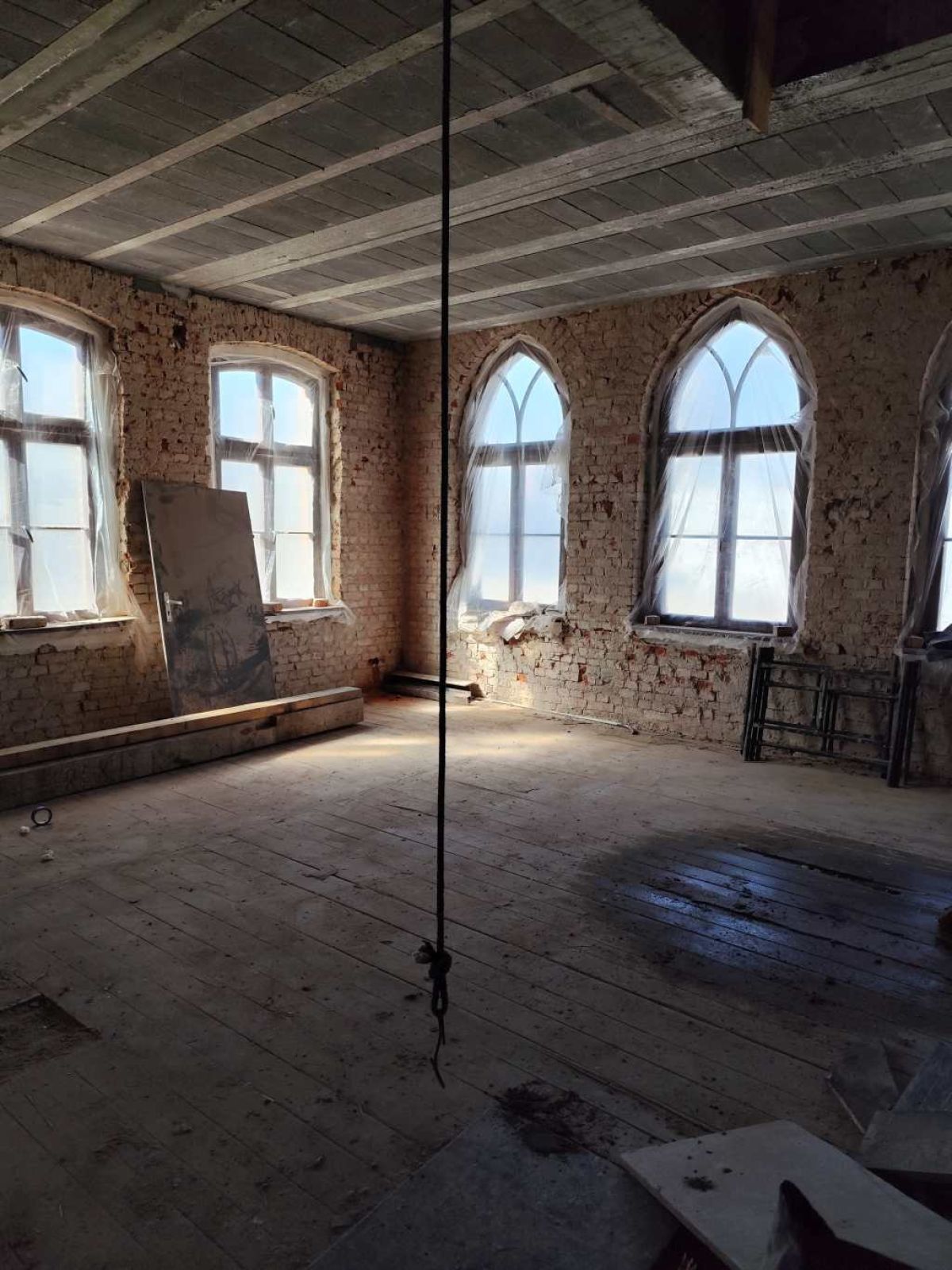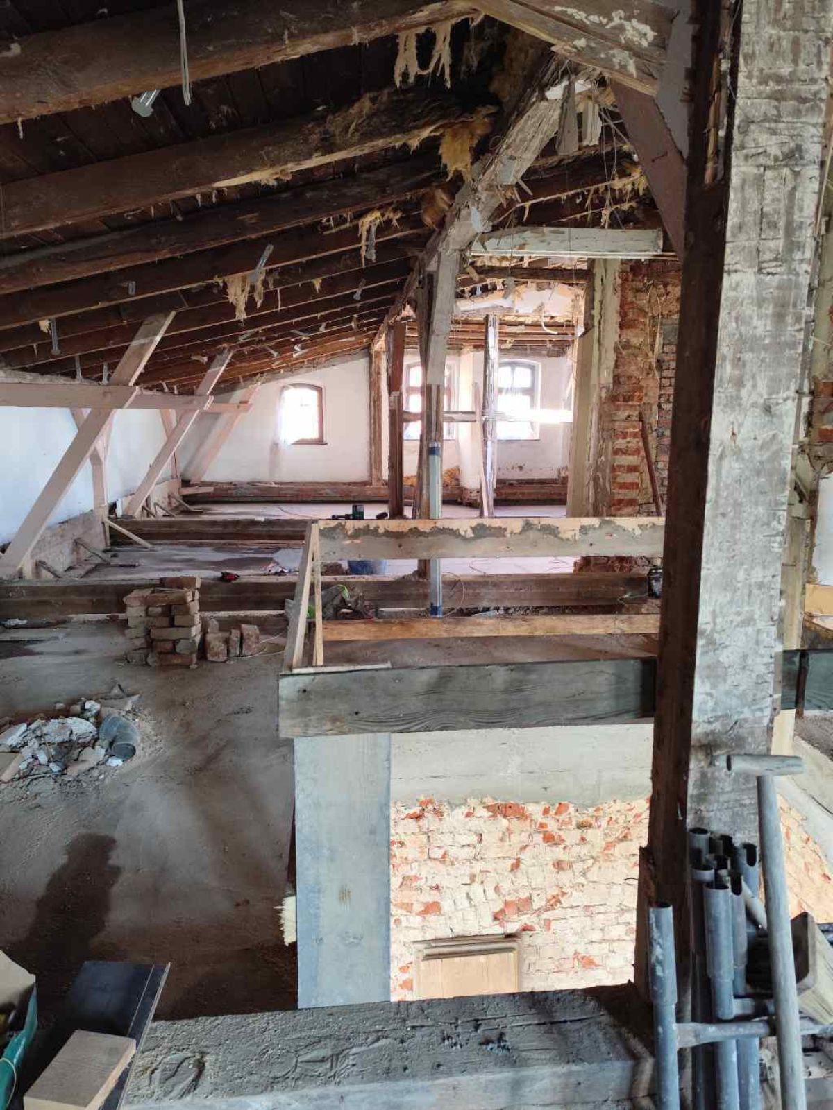 Obecnie trwają prace związane z m.in. wymianą instalacji elektrycznej, hydraulicznej i sanitarnej, prace związane z przebudową pomieszczeń wewnętrznych, prace przygotowawcze dotyczące wymiany dachu wraz z konstrukcją, montażu windy wewnętrznej. Został już wykonany nowy betonowy strop pomiędzy I a II piętrem.