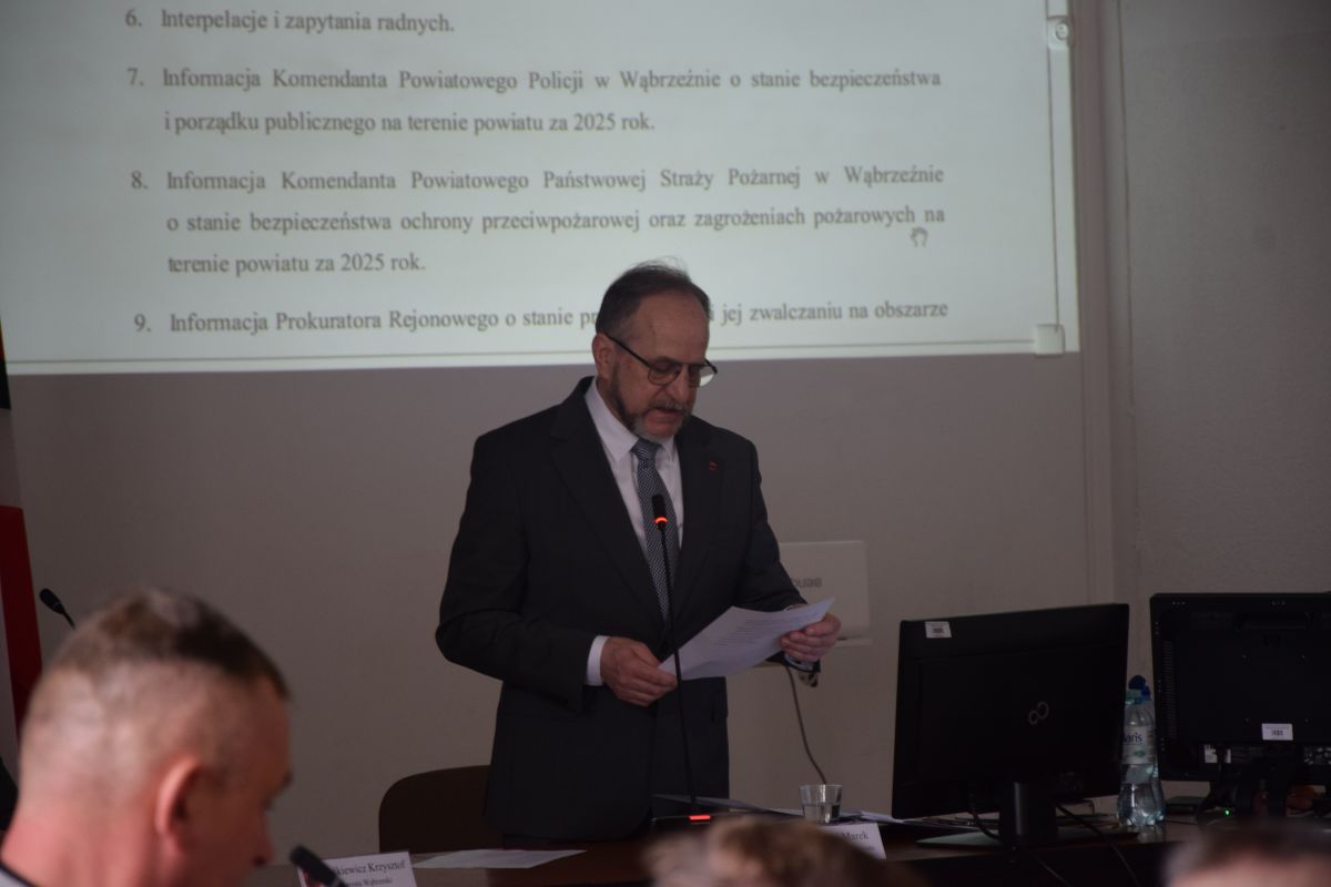 Następnie radni zapoznali się z informacją Komendanta Powiatowego Policji w Wąbrzeźnie o stanie bezpieczeństwa i porządku publicznego na terenie powiatu za 2025 rok oraz informacją Komendanta Powiatowego Państwowej Straży Pożarnej w Wąbrzeźnie o stanie bezpieczeństwa ochrony przeciwpożarowej oraz zagrożeniach pożarowych na terenie powiatu za 2025 rok.