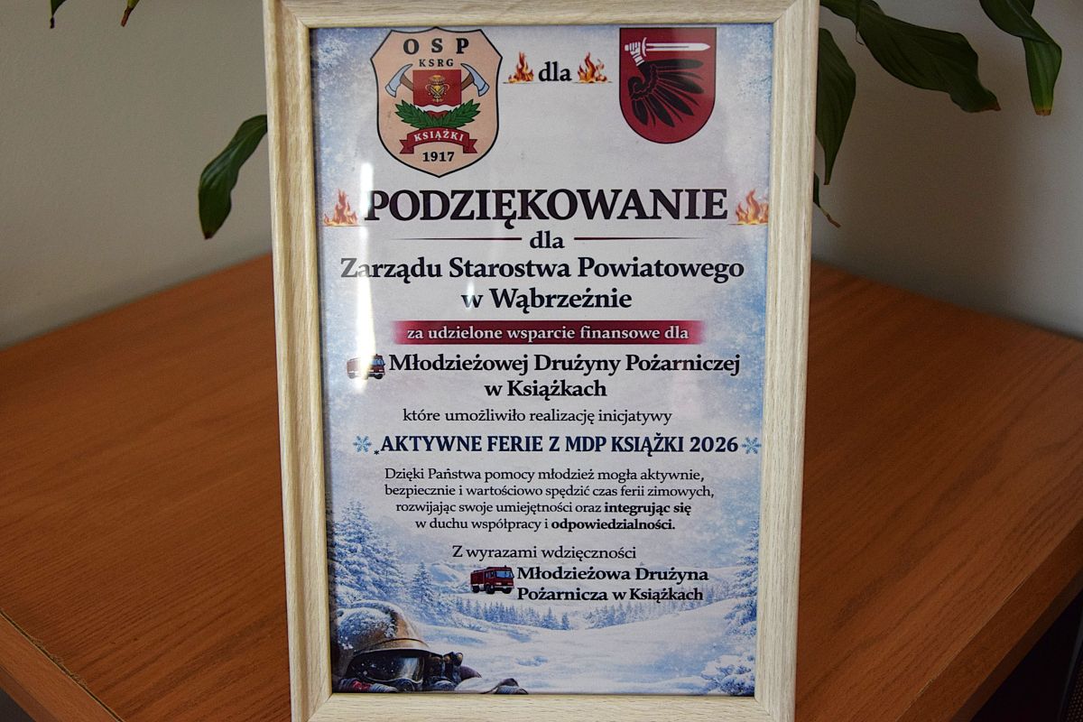 W ramach wolnych wniosków i oświadczeń radnych Tomasz Michna złożył na ręce Starosty podziękowania dla Zarządu Powiatu w Wąbrzeźnie za udzielenie wsparcia finansowego dla Młodzieżowej Drużyny Pożarniczej w Książkach, które umożliwiło realizację inicjatywy „Aktywne ferie z MDP Książki 2026”.