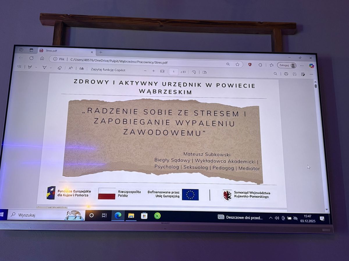 W dniu 03 grudnia 2025 r., w ramach projektu „Zdrowy i aktywny urzędnik w Powiecie Wąbrzeskim”, współfinansowanego ze środków Europejskiego Funduszu Społecznego Plus w ramach Działania 08.08 Wsparcie w obszarze zdrowia programu Fundusze Europejskie dla Kujaw i Pomorza 2021-2027 odbyły się warsztaty pt. „Identyfikacja symptomów wypalenia oraz jego konsekwencji dla pracowników PUP i SP w Wąbrzeźnie”.