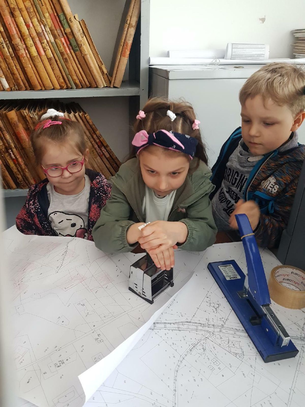 Ostatnim wydziałem, jaki zwiedziły dzieci był PODGiK, gdzie Pan Kierownik Bogdan Matuszewski wraz z pracownikami pokazał dzieciom, jak wykonuje się mapy geodezyjne oraz opowiedział kto to jest geodeta.
