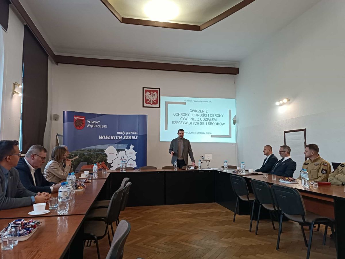 W dniu 24 listopada br. w Starostwie Powiatowym w Wąbrzeźnie odbyło się spotkanie podsumowujące ćwiczenia ochrony ludności i obrony cywilnej oraz trening systemu stałych dyżurów pk. "Stały Dyżur 25", w którym uczestniczyli między innymi: Starosta Wąbrzeski, Wicestarosta, Burmistrz Wąbrzeźna, Wójtowie, Komendanci Powiatowi PSP i Policji, Sekretarz Powiatu oraz pracownicy urzędów zatrudnieni na stanowiskach dot. zarządzania kryzysowego, obrony cywilnej i obronności.