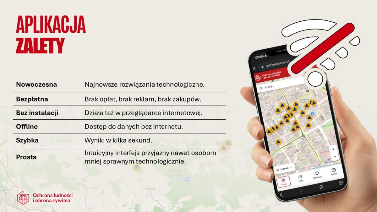 „Gdzie się ukryć” to nowoczesne i przyjazne narzędzie, które może posiadać każdy obywatel. Zostało zaprojektowana z myślą o prostocie i skuteczności: wystarczy telefon komórkowy typu smartfon by w sytuacji nagłego zagrożenia – np. bardzo silnego wiatru czy potencjalnych zagrożenie środkami napadu powietrznego – szybko odnaleźć najbliższe Punkty Schronienia (PS).