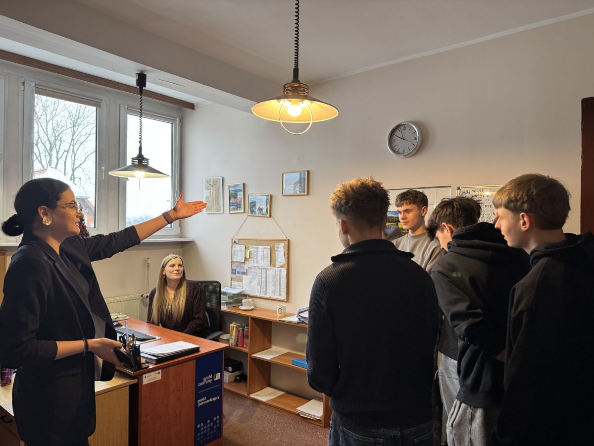 Uczniowie mieli również okazję zajrzeć „za kulisy” urzędu – zwiedzili biura Starosty i Wicestarosty oraz poznali układ organizacyjny Starostwa. Bardzo ciepło zostali przyjęci przez kierowników wydziałów, m.in. Pana Karola Eichbergera – Kierownika Wydziału Rolnictwa, Ochrony Środowiska i Gospodarki Wodnej oraz Pana Mirosława Okrasę – Zastępcę Kierownika Wydziału Organizacyjnego, który opowiedział o zasadach zakładania profilu zaufanego, a także Pana Pawła Sarneckiego – Inspektora ds. obronnych, zarządzania kryzysowego i obrony cywilnej. W tym zakresie uczniowie mieli okazję zobaczyć ćwiczenia z łączności na wypadek zagrożenia bombardowaniem.