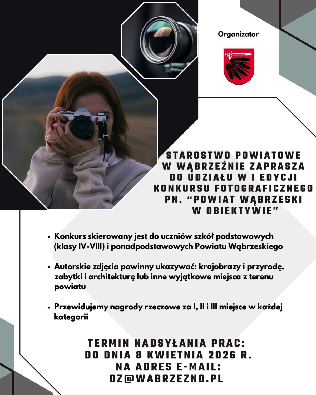 Starostwo Powiatowe w Wąbrzeźnie zaprasza uczniów do udziału w konkursie fotograficznym pn.: „Powiat Wąbrzeski w obiektywie”. Celem konkursu jest ukazanie piękna Powiatu Wąbrzeskiego – jego przyrody, zabytków, kultury, architektury, życia codziennego mieszkańców oraz wyjątkowych miejsc znajdujących się na terenie powiatu. Liczymy na kreatywność uczestników i autorskie spojrzenie na to, co czyni nasz region wyjątkowym.